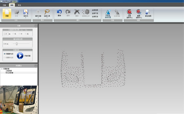 以全局?jǐn)z影測量系統(tǒng)獲得的標(biāo)記點數(shù)據(jù)為整體基準(zhǔn),輻射到個別掃描區(qū)域,掃描汽車整車以及部分拆解后的零件,獲取其三維數(shù)據(jù)。